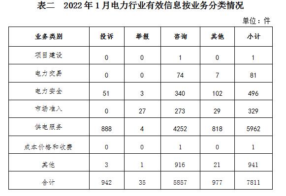 按訴求性質分類,投訴968件,占有效信息的8.02%;舉報37件,占有效信息的0.31%;咨詢9994件,占有效信息的82.80%;表揚、求助、建議等其他方面1070件,占有效信息的8.87%。 按反映渠道分類,12398電話11383件,12398互聯網終端478件,電子郵件89件,留言119件。 二、分類情況 2022年1月收到的有效信息中: 電力行業排在首位,有效信息數量為7811件,占全部有效信息的64.71%。群眾關注的內容主要集中在故障停電、供電安全、電費計量和收繳等方面。(2022年1月電力行業有效信息按業務分類情況見表二)
