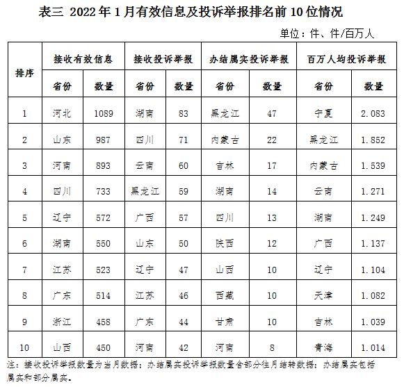 石油天然氣行業排在第二位,有效信息數量為2468件,占全部有效信息的20.45%。群眾關注的內容主要集中在咨詢居民燃氣安裝及收費、反映燃氣故障問題等方面。 新能源和可再生能源行業排在第三位,有效信息數量為551件,占全部有效信息的4.57%。群眾關注的內容主要集中在居民分布式光伏發電項目并網、電費結算等方面。 其他有效信息合計1239件,占全部有效信息的10.27%。其中涉及煤炭行業的主要集中在煤炭行業政策、煤礦項目信息等方面。 三、分布情況 各省(自治區、直轄市)按照接收的有效信息數量排序,河北、山東、河南、四川、遼寧、湖南、江蘇、廣東、浙江、山西排在全國前10位;按照接收的投訴舉報數量排序,湖南、四川、云南、黑龍江、廣西、山東、遼寧、江蘇、廣東、河南排在全國前10位;按照辦結屬實的投訴舉報數量排序,黑龍江、內蒙古、吉林、湖南、四川、陜西、山西、西藏、甘肅、河南排在全國前10位;按照百萬人均投訴舉報數量排序,寧夏、黑龍江、內蒙古、云南、湖南、廣西、遼寧、天津、吉林、青海排在全國前10位。(2022年1月有效信息及投訴舉報排名前10位情況見表三)