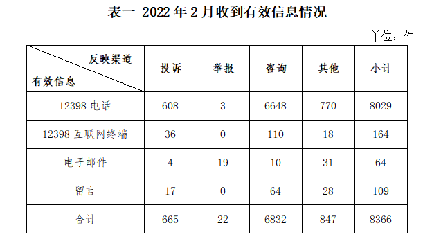 一、基本情況 2022年2月,國家能源局12398能源監管熱線(以下簡稱12398熱線)共收到有效信息8366件(包含投訴、舉報、咨詢和其他訴求類別),環比減少30.68%,同比增加10.27%。(2022年2月收到有效信息情況見表一)