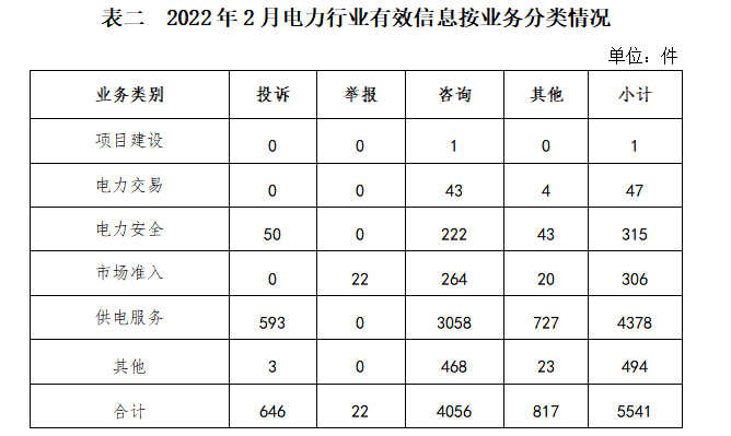 按訴求性質分類,投訴665件,占有效信息的7.95%;舉報22件,占有效信息的0.26%;咨詢6832件,占有效信息的81.67%;表揚、求助、建議等其他方面847件,占有效信息的10.12%。 按反映渠道分類,12398電話8029件,12398互聯網終端164件,電子郵件64件,留言109件。 二、分類情況 2022年2月收到的有效信息中: 電力行業排在首位,有效信息數量為5541件,占全部有效信息的66.24%。群眾關注的內容主要集中在供電服務、電力安全、成本價格和收費等方面。(2022年2月電力行業有效信息按業務分類情況見表二)