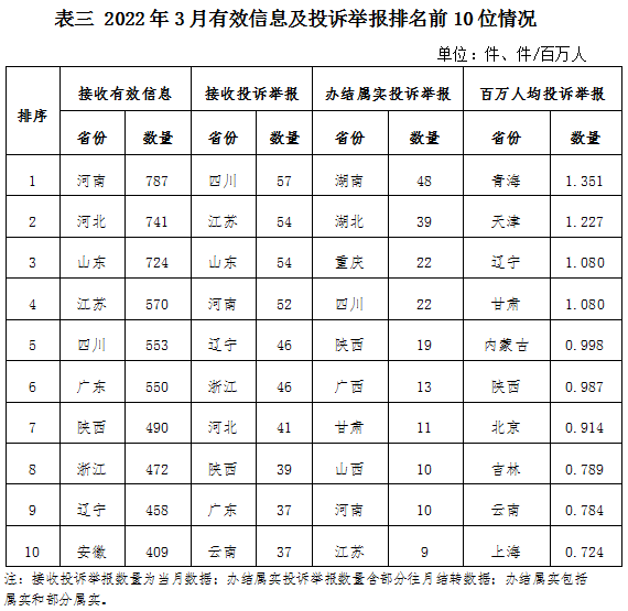 石油天然氣行業排在第二位,有效信息數量為1402件,占全部有效信息的13.50%。群眾關注的內容主要集中在咨詢居民燃氣安裝及收費、反映燃氣故障問題等方面。 新能源和可再生能源行業排在第三位,有效信息數量為701件,占全部有效信息的6.75%。群眾關注的內容主要集中在居民分布式光伏發電項目并網、電費結算等方面。 其他有效信息合計1245件,占全部有效信息的11.99%。其中涉及煤炭行業的主要集中在煤炭行業政策、煤礦項目信息等方面。 三、分布情況 各省(自治區、直轄市)按照接收的有效信息數量排序,河南、河北、山東、江蘇、四川、廣東、陜西、浙江、遼寧、安徽排在全國前10位;按照接收的投訴舉報數量排序,四川、江蘇、山東、河南、遼寧、浙江、河北、陜西、廣東、云南排在全國前10位;按照辦結屬實的投訴舉報數量排序,湖南、湖北、重慶、四川、陜西、廣西、甘肅、山西、河南、江蘇排在全國前10位;按照百萬人均投訴舉報數量排序,青海、天津、遼寧、甘肅、內蒙古、陜西、北京、吉林、云南、上海排在全國前10位。(2022年3月有效信息及投訴舉報排名前10位情況見表三)