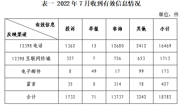 一、基本情況 2022年7月,國(guó)家能源局12398能源監(jiān)管熱線(以下簡(jiǎn)稱12398熱線)共收到有效信息18782件(包含投訴、舉報(bào)、咨詢和其他訴求類別),環(huán)比增加27.09%,同比增加46.48%。(2022年7月收到有效信息情況見表一)