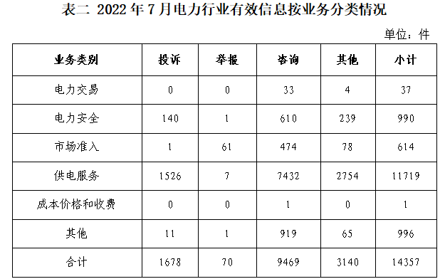 按訴求性質(zhì)分類,投訴1732件,占有效信息的9.22%;舉報(bào)71件,占有效信息的0.38%;咨詢13737件,占有效信息的73.14%;表揚(yáng)、求助、建議等其他方面3242件,占有效信息的17.26%。 按反映渠道分類,12398電話16469件,12398互聯(lián)網(wǎng)終端1713件,電子郵件173件,留言427件。 二、分類情況 2022年7月收到的有效信息中: 電力行業(yè)排在首位,有效信息數(shù)量為14357件,占全部有效信息的76.44%。群眾關(guān)注的內(nèi)容主要集中在供電服務(wù)、電力安全、市場(chǎng)準(zhǔn)入等方面。(2022年7月電力行業(yè)有效信息按業(yè)務(wù)分類情況見表二)