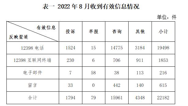 一、基本情況 2022年8月,國家能源局12398能源監管熱線(以下簡稱12398熱線)共收到有效信息22182件(包含投訴、舉報、咨詢和其他訴求類別),環比增加18.10%,同比增加77.67%。(2022年8月收到有效信息情況見表一)