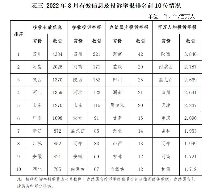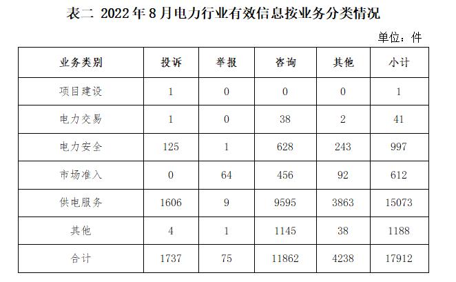 按訴求性質分類,投訴1794件,占有效信息的8.09%;舉報79件,占有效信息的0.36%;咨詢15961件,占有效信息的71.95%;表揚、求助、建議等其他方面4348件,占有效信息的19.60%。 按反映渠道分類,12398電話19498件,12398互聯網終端1853件,電子郵件216件,留言615件。 二、分類情況 2022年8月收到的有效信息中: 電力行業排在首位,有效信息數量為17912件,占全部有效信息的80.75%。群眾關注的內容主要集中在供電服務、電力安全、市場準入等方面。(2022年8月電力行業有效信息按業務分類情況見表二) 石油天然氣行業排在第二位,有效信息數量為2252件,占全部有效信息的10.15%。群眾關注的內容主要集中在居民燃氣安裝及收費、燃氣故障等方面。 新能源和可再生能源行業排在第三位,有效信息數量為832件,占全部有效信息的3.75%。群眾關注的內容主要集中在分布式光伏發電項目并網,電費結算、補貼發放等方面。 煤炭行業有效信息數量為25件,占全部有效信息的0.11%。群眾關注的內容主要集中在煤炭行業政策、煤礦安全等方面。 其他有效信息合計1161件,占全部有效信息的5.23%。 三、分布情況 各省(自治區、直轄市)按照接收的有效信息數量排序,四川、河南、陜西、河北、山東、廣東、浙江、江蘇、安徽、湖北排在全國前10位;按照接收的投訴舉報數量排序,四川、河南、陜西、河北、山東、湖北、黑龍江、遼寧、安徽、內蒙古排在全國前10位;按照辦結屬實的投訴舉報數量排序,河南、重慶、四川、湖南、黑龍江、甘肅、河北、山西、吉林、內蒙古排在全國前10位;按照百萬人均投訴舉報數量排序,陜西、內蒙古、黑龍江、四川、天津、重慶、吉林、遼寧、河南、甘肅排在全國前10位。(2022年8月有效信息及投訴舉報排名前10位情況見表三) 四、主要問題 8月接收的投訴舉報反映的問題主要集中在電力行業,其次是新能源和可再生能源行業。 電力行業投訴舉報數量為1812件,占全部投訴舉報數量的96.74%。反映的主要問題有:一是迎峰度夏期間,部分地區高溫極端天氣多發,用電負荷持續高位,四川、河南、陜西等地部分區域頻繁停電、季節性低電壓問題頻發;二是部分地區惡劣天氣導致故障停電,且受交通及天氣影響,搶修不及時、停電時間長的情況較多;三是個別企業提供虛假材料,冒用其他企業員工電工證件,申請承裝(修、試)資質。 新能源和可再生能源行業投訴舉報數量為61件,占全部投訴舉報數量的3.26%。反映的主要問題是分布式光伏發電項目并網存在困難,上網電費結算、補貼轉付不及時等。 五、處理結果 2022年8月共收到投訴舉報事項1873件,根據國家有關法律法規規定,國家能源局派出機構對屬于監管職責范圍的1665件進行了受理,占投訴舉報量的88.89%;其他不屬于能源監管職責范圍的,已按照有關規定進行了及時轉辦,并將相關情況及時告知了當事人。 針對群眾反映的投訴舉報,國家能源局派出機構嚴格依據國家有關法律法規及文件規定進行了處理:一是督促指導供電企業,加快電能質量、服務行為、停電搶修等群眾反映問題的解決,保障了群眾正常生產生活;二是通過行政處罰、監管約談、責令整改等方式,糾正了有關企業違法違規行為,維護了公平公正的市場秩序和群眾的合法權益;三是通過解釋說明、澄清事實,使當事人消除了誤解。(2022年8月12398熱線典型投訴舉報事項具體處理情況見附件) |