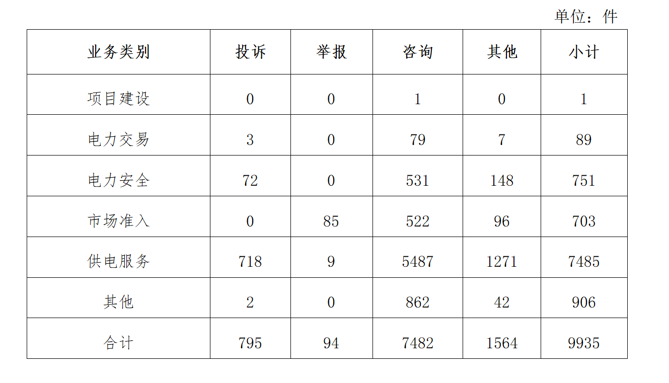 按訴求性質(zhì)分類,投訴846件,占有效信息的5.99%;舉報94件,占有效信息的0.67%;咨詢11525件,占有效信息的81.64%;表揚、求助、建議等其他方面1652件,占有效信息的11.70%。 按反映渠道分類,12398電話13117件,12398互聯(lián)網(wǎng)終端655件,電子郵件200件,留言145件。 二、分類情況 2022年9月收到的有效信息中: 電力行業(yè)排在首位,有效信息數(shù)量為9935件,占全部有效信息的70.38%。群眾關(guān)注的內(nèi)容主要集中在供電服務(wù)、電力安全、市場準(zhǔn)入等方面。(2022年9月電力行業(yè)有效信息按業(yè)務(wù)分類情況見表二) 表二 2022年9月電力行業(yè)有效信息按業(yè)務(wù)分類情況