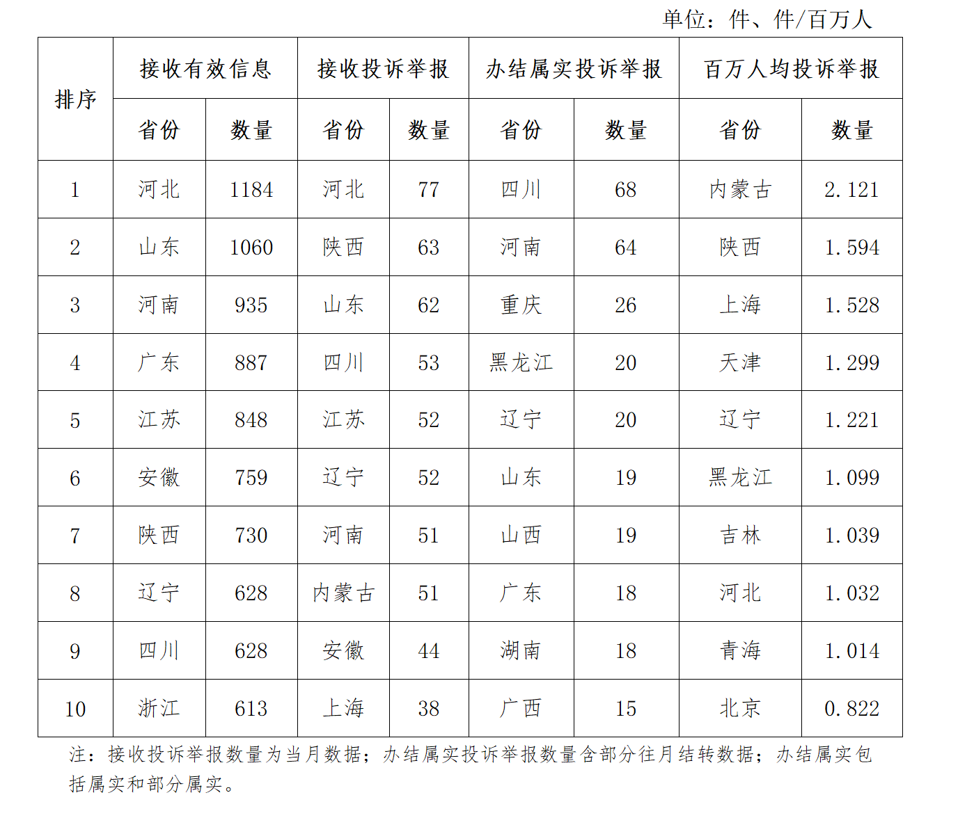 石油天然氣行業(yè)排在第二位,有效信息數(shù)量為2239件,占全部有效信息的15.86%。群眾關(guān)注的內(nèi)容主要集中在居民燃?xì)獍惭b及收費、燃?xì)夤收系确矫妗?/p> 新能源和可再生能源行業(yè)排在第三位,有效信息數(shù)量為835件,占全部有效信息的5.91%。群眾關(guān)注的內(nèi)容主要集中在分布式光伏發(fā)電項目并網(wǎng),電費結(jié)算、補(bǔ)貼發(fā)放等方面。 煤炭行業(yè)有效信息數(shù)量為36件,占全部有效信息的0.26%。群眾關(guān)注的內(nèi)容主要集中在煤炭行業(yè)政策、煤炭價格、煤礦安全等方面。 其他有效信息合計1072件,占全部有效信息的7.59%。 三、分布情況 各省(自治區(qū)、直轄市)按照接收的有效信息數(shù)量排序,河北、山東、河南、廣東、江蘇、安徽、陜西、遼寧、四川、浙江排在全國前10位;按照接收的投訴舉報數(shù)量排序,河北、陜西、山東、四川、江蘇、遼寧、河南、內(nèi)蒙古、安徽、上海排在全國前10位;按照辦結(jié)屬實的投訴舉報數(shù)量排序,四川、河南、重慶、黑龍江、遼寧、山東、山西、廣東、湖南、廣西排在全國前10位;按照百萬人均投訴舉報數(shù)量排序,內(nèi)蒙古、陜西、上海、天津、遼寧、黑龍江、吉林、河北、青海、北京排在全國前10位。(2022年9月有效信息及投訴舉報排名前10位情況見表三) 表三 2022年9月有效信息及投訴舉報排名前10位情況