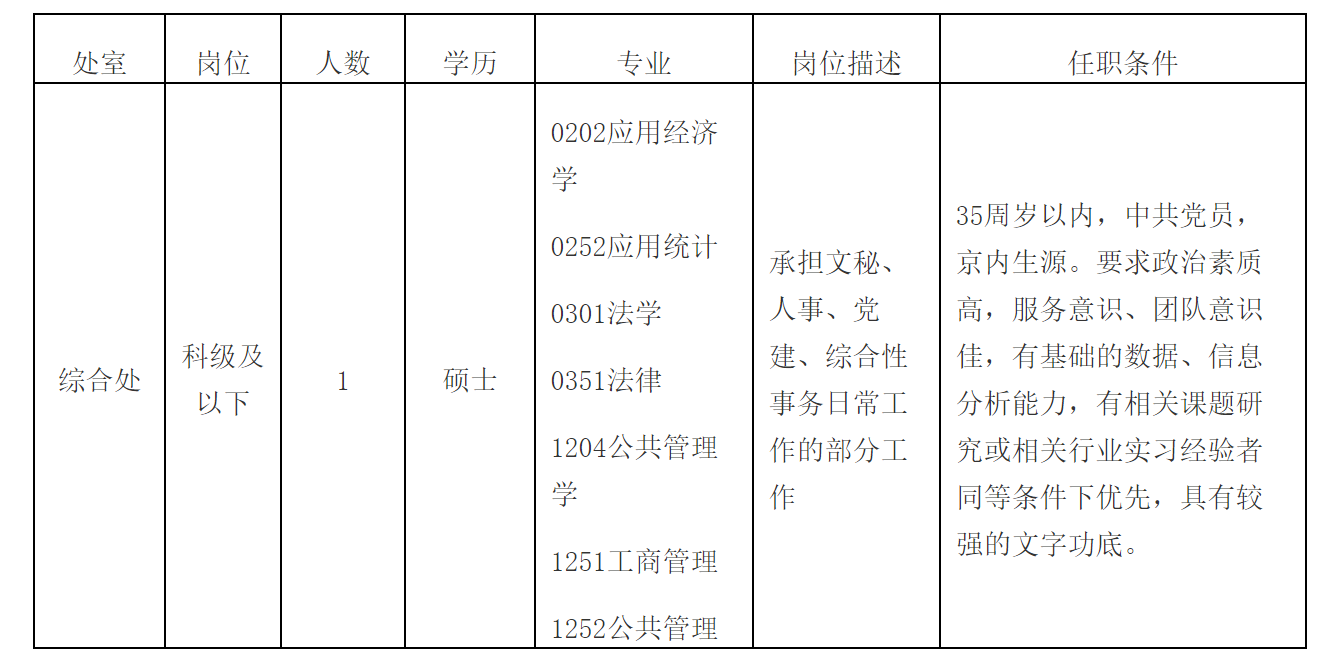 綜合處主任科員及以下崗位1人(京內(nèi)生源的碩士應(yīng)屆畢業(yè)生)。35周歲以內(nèi),中共黨員,要求政治素質(zhì)高,服務(wù)意識(shí)、團(tuán)隊(duì)意識(shí)佳,有基礎(chǔ)的數(shù)據(jù)、信息分析能力,同等條件下有相關(guān)課題研究或相關(guān)行業(yè)實(shí)習(xí)經(jīng)驗(yàn)者優(yōu)先,具有較強(qiáng)的文字功底。具體要求詳見下表。