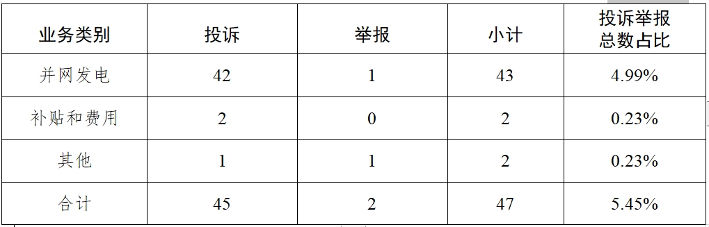 新能源和可再生能源行業排在第二位,數量為47件、占投訴舉報總數的5.45%,主要集中在并網發電、補貼和費用等方面。 表二 新能源和可再生能源行業接收投訴舉報業務分類情況表