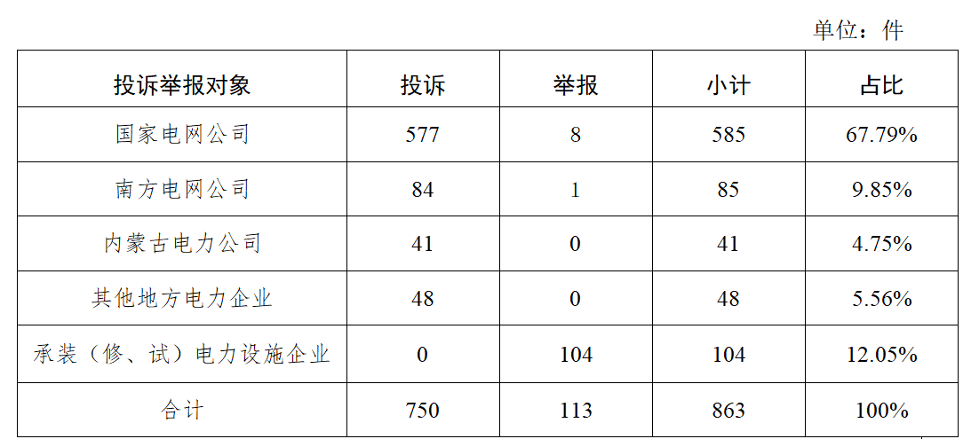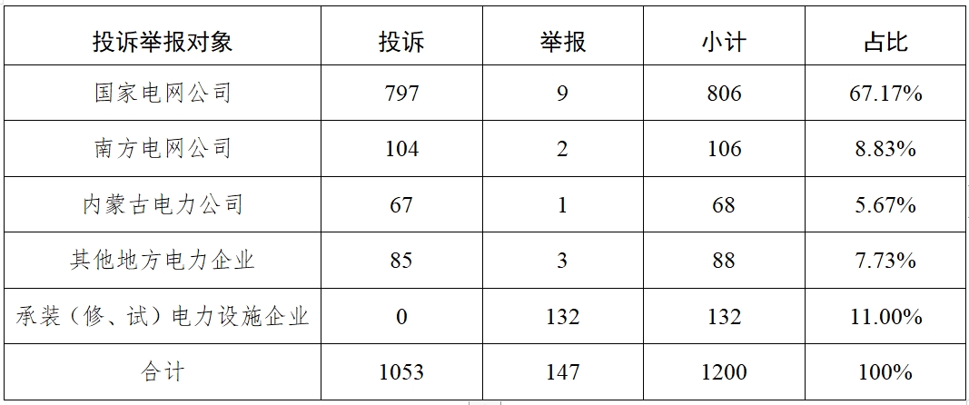 從被投訴舉報對象看,供電企業1068件、占投訴舉報總數的89.00%,其中國家電網公司806件、占比67.17%,南方電網公司106件、占比8.83%,內蒙古電力公司68件、占比5.67%,其他地方電力企業88件、占比7.33%;承裝(修、試)電力設施企業132件、占比11.00%。