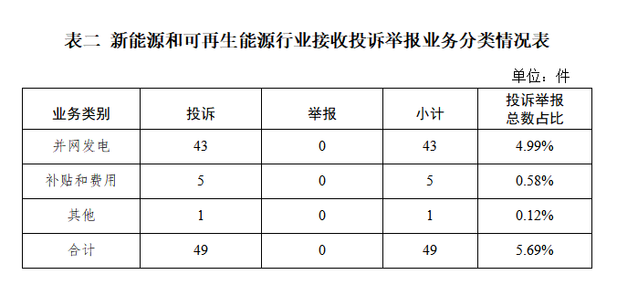 新能源和可再生能源行業(yè)排在第二位,數(shù)量為49件、占投訴舉報(bào)總數(shù)的5.69%,主要集中在并網(wǎng)發(fā)電、補(bǔ)貼和費(fèi)用等方面。