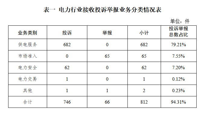 2023年11月,國家能源局12398能源監(jiān)管熱線(以下簡稱12398熱線)共接收投訴舉報(bào)861件,辦結(jié)投訴舉報(bào)879件(含往期結(jié)轉(zhuǎn))。現(xiàn)將有關(guān)情況通報(bào)如下: 一、當(dāng)月接收情況 2023年11月,12398熱線共接收投訴舉報(bào)861件,環(huán)比下降3.15%、同比增長25.15%。其中:投訴795件,環(huán)比增長0.89%、同比增長32.06%;舉報(bào)66件,環(huán)比下降34.65%、同比下降23.26%。 (一)分類情況 1.按被投訴舉報(bào)行業(yè)分類 電力行業(yè)排在首位,數(shù)量為812件、占投訴舉報(bào)總數(shù)的94.31%,主要集中在供電服務(wù)、市場(chǎng)準(zhǔn)入、電力安全等方面。