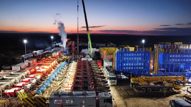 大慶古龍頁巖油產區 長慶慶城油田加大長7頁巖油研究攻關力度,圍繞新類型紋層型頁巖油開展試驗,5口水平井壓裂試油均獲成功。創新布井模式,形成了“短悶、強排、控采”全生命周期技術,開發效果穩步提升,儲量動用程度由50%提升到85%。2023年頁巖油產量207萬噸,連續五年保持30萬噸增長。 (二)頁巖氣發展向深層跨越,突破邁進新層系 頁巖氣國家級示范區建設穩步推進。長寧-威遠頁巖氣田精細劃分開發單元,針對性制定調整措施,鉆獲威215、自208等一批評價井,展示外圍區良好潛力,有力支撐長寧-威遠區塊全年穩產超95億立方米。涪陵頁巖氣田立體開發提高采收率技術持續提升,焦石壩區塊形成“中北區三層立體開發、南區中上部氣層聯合開發”模式,有利區采收率最高可達44.6%,實現儲量效益動用,年產量超85億立方米。 頁巖氣持續縱深發展,積極探索新區新層系。隨著中國石化的金石103井、中國石油的資201、威頁1井先后在寒武系筇竹寺組地層獲高產工業氣流,揭開寒武系超深層頁巖氣萬億級規模增儲的新陣地。普光二疊系大隆組海相深層頁巖氣部署實施的雷頁1HF井,完鉆井深5880米,率先在四川盆地實現二疊系深層頁巖氣勘探重大突破,評價落實資源量1727億立方米。紅星二疊系茅四段、吳二段千億立方米規模增儲陣地進一步落實,培育形成“兩層樓”勘探新場面。