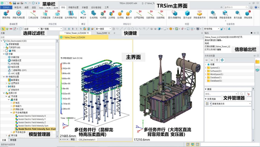 完成單位: 國家能源特高壓直流輸電工程成套設計研發(實驗)中心 三、高壓電力裝備多物理場計算專用軟件TRSim 形成首款幾何建模、網格剖分、計算求解、后處理全流程全自主內核的國產電力裝備多物理場計算專用軟件,解決了使用通用商業軟件數據傳遞失真和計算效率低等問題。成果在昆柳龍特高壓多端混合直流輸電工程開展了應用驗證,為工程設備設計運行、運維分析等提供技術支撐,對推動國產電力裝備專用軟件產品生態發展具有重大意義。