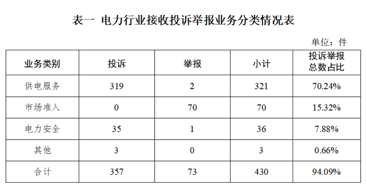 2024年3月,國家能源局12398能源監管熱線(以下簡稱12398熱線)共接收投訴舉報457件,辦結投訴舉報530件(含往期結轉)?,F將有關情況通報如下: 一、當月接收情況 2024年3月,12398熱線共接收投訴舉報457件,同比下降28.44%、環比增長5.79%。其中:投訴383件,同比下降28.54%、環比下降4.73%;舉報74件,同比下降23.71%、環比增長146.67%。 ?。ㄒ唬┓诸惽闆r 1.按被投訴舉報行業分類 電力行業排在首位,數量為430件、占投訴舉報總數的94.09%,主要集中在供電服務、市場準入、電力安全等方面。 ?