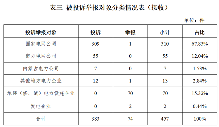 2.按被投訴舉報對象分類 供電企業385件、占投訴舉報總數的84.24%,其中國家電網公司310件、占投訴舉報總數的67.83%,南方電網公司55件、占投訴舉報總數的12.04%,內蒙古電力公司7件、占投訴舉報總數的1.53%,其他地方電力企業13件、占投訴舉報總數的2.84%;承裝(修、試)電力設施企業70件、占投訴舉報總數的15.32%;發電企業2件、占投訴舉報總數的0.44%。