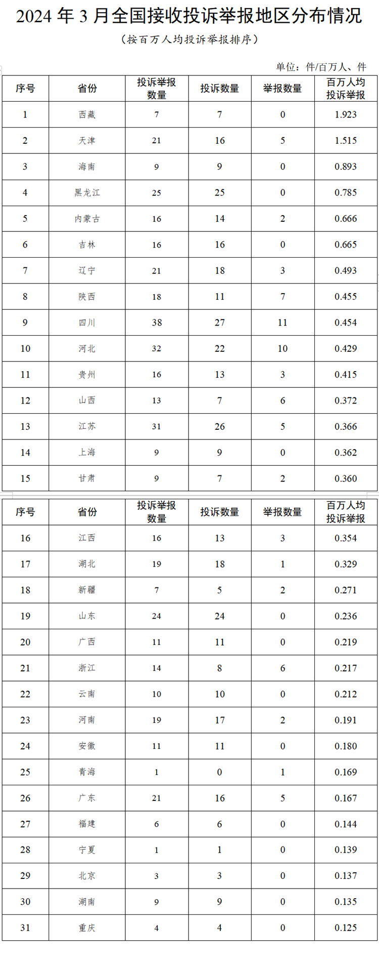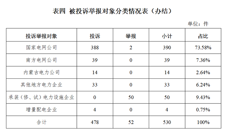 ?。ǘ┑貐^分布情況 各?。ㄗ灾螀^、直轄市)按照接收投訴舉報數量排序,四川、河北、江蘇、黑龍江、山東排在全國前5位。按百萬人均投訴舉報數量排序,西藏、天津、海南、黑龍江、內蒙古排在全國前5位。(2024年3月全國接收投訴舉報地區分布情況,見附件1) ?。ㄈ┲饕獑栴} 2024年3月,接收的投訴舉報主要反映了4個方面的問題。 1.電能質量問題。受線路設備故障、臺區末端供電能力不足等因素影響,導致故障停電、低電壓等問題。 投訴舉報數量靠前的2個省份為黑龍江(11件)、四川(9件)。 2.承裝(修、試)電力設施許可問題。承裝(修、試)電力設施企業未及時在資質和信用信息系統解綁已離職人員信息,造成人員信息占用,影響其他企業申請許可證。 舉報數量靠前的2個省份為四川(11件)、河北(10件)。 3.停電搶修問題。受東北、內蒙古、西藏等部分地區低溫雨雪冰凍災害影響,個別供電企業在發生故障停電后,搶修時間較長或用戶欠費停電后復電時間較長。 投訴舉報數量靠前的2個省份為黑龍江(6件)、四川(6件)。 4.新能源和可再生能源行業相關問題。部分地區分布式光伏發電項目因當地臺區容量不足導致并網困難。 投訴舉報數量靠前的2個省份為江西(5件)、河南(4件)。 二、當月處理情況 ?。ㄒ唬┦芾砬闆r 2024年3月,根據國家有關法規政策規定,國家能源局派出機構對屬于監管職責范圍的439件投訴舉報進行了受理,占接收數量的96.06%;其他不予受理的,已按照國家有關法規政策及時轉辦。 ?。ǘ┺k結情況 2024年3月,國家能源局派出機構辦結投訴舉報530件(含往期結轉),同比下降30.17%、環比增長0.76%,累計辦結率98.98%。其中:投訴478件,同比下降30.32%、環比下降3.04%;舉報52件,同比增長57.58%、環比下降28.77%。 從被投訴舉報對象看,供電企業476件、占投訴舉報總數的89.82%,其中國家電網公司390件、占比73.58%;南方電網公司39件、占比7.36%;內蒙古電力公司14件、占比2.64%;其他地方電力企業33件、占比6.24%;承裝(修、試)電力設施企業50件、占比9.43%;增量配電企業4件、占比0.75%。