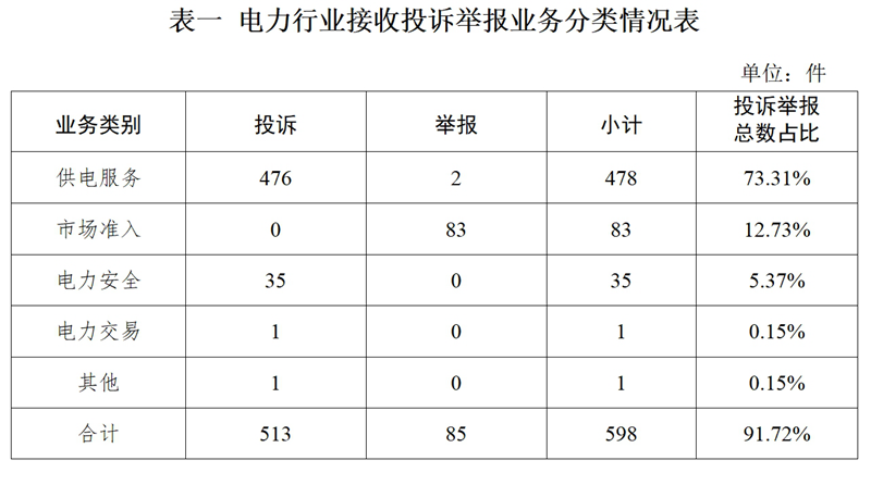 2024年4月,國家能源局12398能源監(jiān)管熱線(以下簡稱12398熱線)共接收投訴舉報(bào)652件,辦結(jié)投訴舉報(bào)542件(含往期結(jié)轉(zhuǎn))。現(xiàn)將有關(guān)情況通報(bào)如下: 一、當(dāng)月接收情況 2024年4月,12398熱線共接收投訴舉報(bào)652件,同比增長1.72%、環(huán)比增長42.67%。其中:投訴565件,同比增長6.20%、環(huán)比增長47.52%;舉報(bào)87件,同比下降20.18%、環(huán)比增長17.57%。 (一)分類情況 1.按被投訴舉報(bào)行業(yè)分類 電力行業(yè)排在首位,數(shù)量為598件、占投訴舉報(bào)總數(shù)的91.72%,主要集中在供電服務(wù)、市場準(zhǔn)入、電力安全等方面。