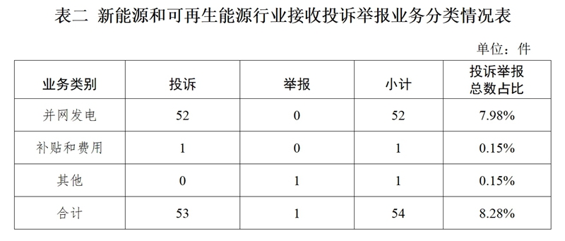 新能源和可再生能源行業(yè)排在第二位,數(shù)量為54件、占投訴舉報(bào)總數(shù)的8.28%,主要集中在并網(wǎng)發(fā)電方面。