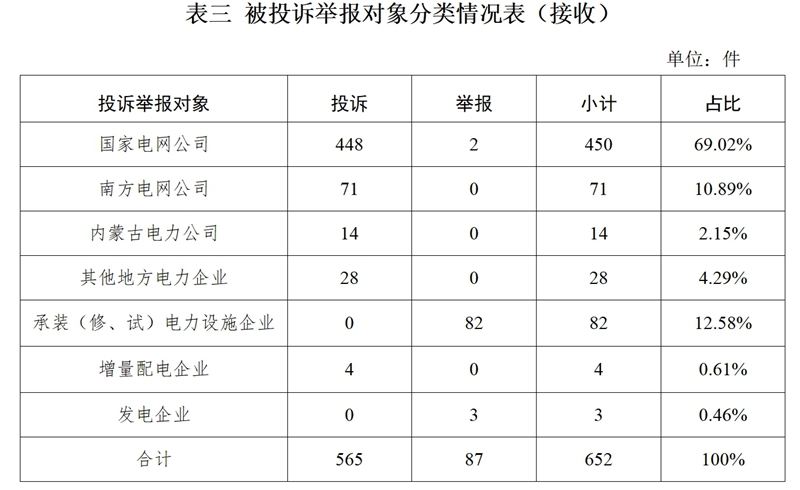 2.按被投訴舉報(bào)對象分類 供電企業(yè)567件、占投訴舉報(bào)總數(shù)的86.96%,其中:國家電網(wǎng)公司450件、占投訴舉報(bào)總數(shù)的69.02%,南方電網(wǎng)公司71件、占投訴舉報(bào)總數(shù)的10.89%,內(nèi)蒙古電力公司14件、占投訴舉報(bào)總數(shù)的2.15%,其他地方電力企業(yè)28件、占投訴舉報(bào)總數(shù)的4.29%,增量配電企業(yè)4件,占投訴舉報(bào)總數(shù)的0.61%;承裝(修、試)電力設(shè)施企業(yè)82件、占投訴舉報(bào)總數(shù)的12.58%;發(fā)電企業(yè)3件、占投訴舉報(bào)總數(shù)的0.46%。