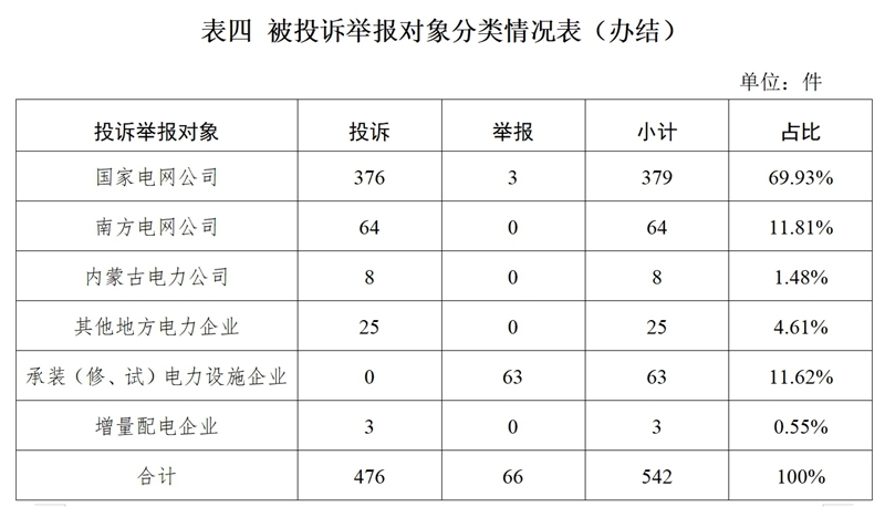 (二)地區(qū)分布情況 各省(自治區(qū)、直轄市)按照接收投訴舉報(bào)數(shù)量排序,遼寧、河北、山東、四川、河南(與陜西并列)排在全國前5位。按百萬人均投訴舉報(bào)數(shù)量排序,遼寧、內(nèi)蒙古、西藏、天津、吉林排在全國前5位。(2024年4月全國接收投訴舉報(bào)地區(qū)分布情況,見附件1) (三)主要問題 2024年4月,接收的投訴舉報(bào)主要反映了4個(gè)方面的問題。 1.電能質(zhì)量問題。受線路超負(fù)荷運(yùn)行、臺(tái)區(qū)末端供電能力不足等因素影響,導(dǎo)致故障停電、低電壓等問題。 投訴舉報(bào)數(shù)量靠前的2個(gè)省份為四川(13件)、廣西(12件)。 2.停電搶修問題。個(gè)別供電企業(yè)在發(fā)生故障停電后搶修時(shí)間較長或計(jì)劃停電超公告時(shí)間引發(fā)群眾投訴。 投訴舉報(bào)數(shù)量靠前的2個(gè)省份為四川(10件)、山東(9件)。 3.承裝(修、試)電力設(shè)施許可問題。承裝(修、試)電力設(shè)施企業(yè)未及時(shí)在資質(zhì)和信用信息系統(tǒng)解綁已離職人員信息,造成人員信息占用,影響其他企業(yè)申請?jiān)S可證。 舉報(bào)數(shù)量靠前的2個(gè)省份為陜西(13件)、河北(11件)。 4.新能源和可再生能源行業(yè)相關(guān)問題。部分地區(qū)分布式光伏發(fā)電項(xiàng)目因當(dāng)?shù)嘏_(tái)區(qū)容量不足導(dǎo)致并網(wǎng)困難。 投訴舉報(bào)數(shù)量靠前的2個(gè)省份為山東(11件)、河南(8件)。 二、當(dāng)月處理情況 (一)受理情況 2024年4月,根據(jù)國家有關(guān)法規(guī)政策規(guī)定,國家能源局派出機(jī)構(gòu)對屬于監(jiān)管職責(zé)范圍的610件投訴舉報(bào)進(jìn)行了受理,占接收數(shù)量的93.55%;其他不予受理的,已按照國家有關(guān)法規(guī)政策及時(shí)轉(zhuǎn)辦。 (二)辦結(jié)情況 2024年4月,國家能源局派出機(jī)構(gòu)辦結(jié)投訴舉報(bào)542件(含往期結(jié)轉(zhuǎn)),同比增長11.75%、環(huán)比增長2.26%,累計(jì)辦結(jié)率98.90%。其中:投訴476件,同比增長17.82%、環(huán)比下降0.42%;舉報(bào)66件,同比下降18.52%、環(huán)比增長26.92%。 從被投訴舉報(bào)對象看,供電企業(yè)478件、占投訴舉報(bào)總數(shù)的88.37%,其中:國家電網(wǎng)公司379件、占比69.93%;南方電網(wǎng)公司64件、占比11.81%;內(nèi)蒙古電力公司8件、占比1.48%;其他地方電力企業(yè)25件、占比4.61%;承裝(修、試)電力設(shè)施企業(yè)63件、占比11.62%;增量配電企業(yè)3件、占比0.55%。