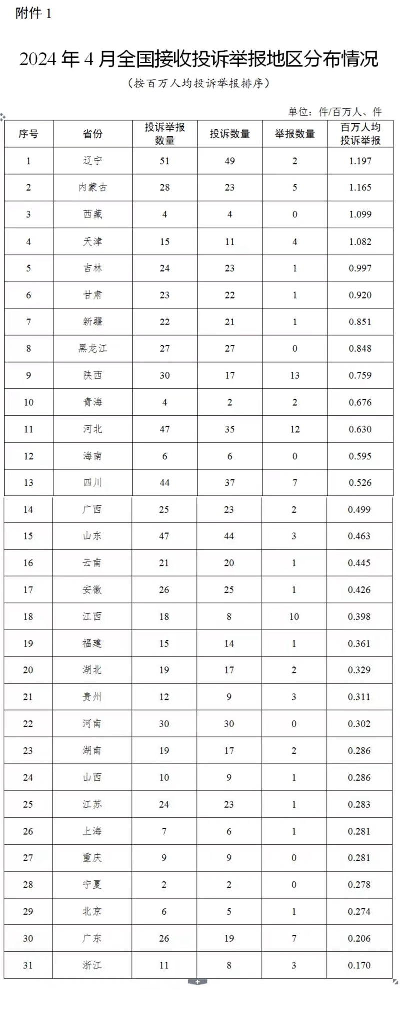 附件:1.2024年4月全國接收投訴舉報(bào)地區(qū)分布情況 ????? 2.2024年4月12398熱線典型投訴舉報(bào)事項(xiàng)具體處理情況