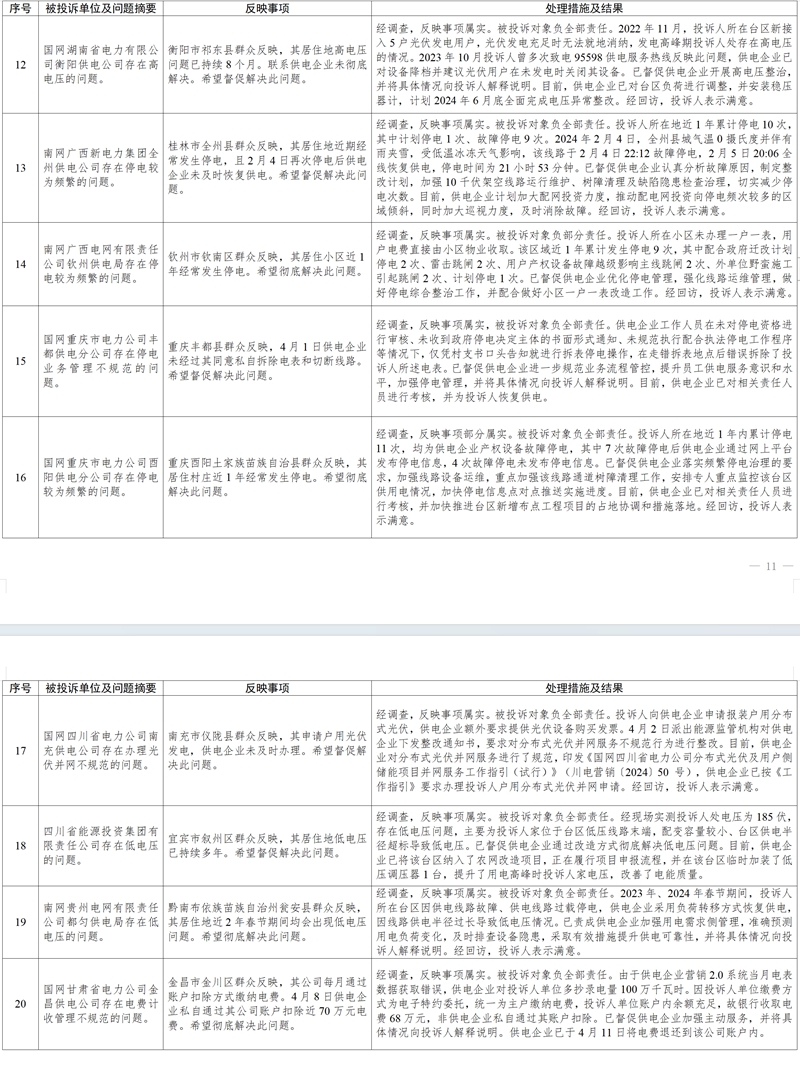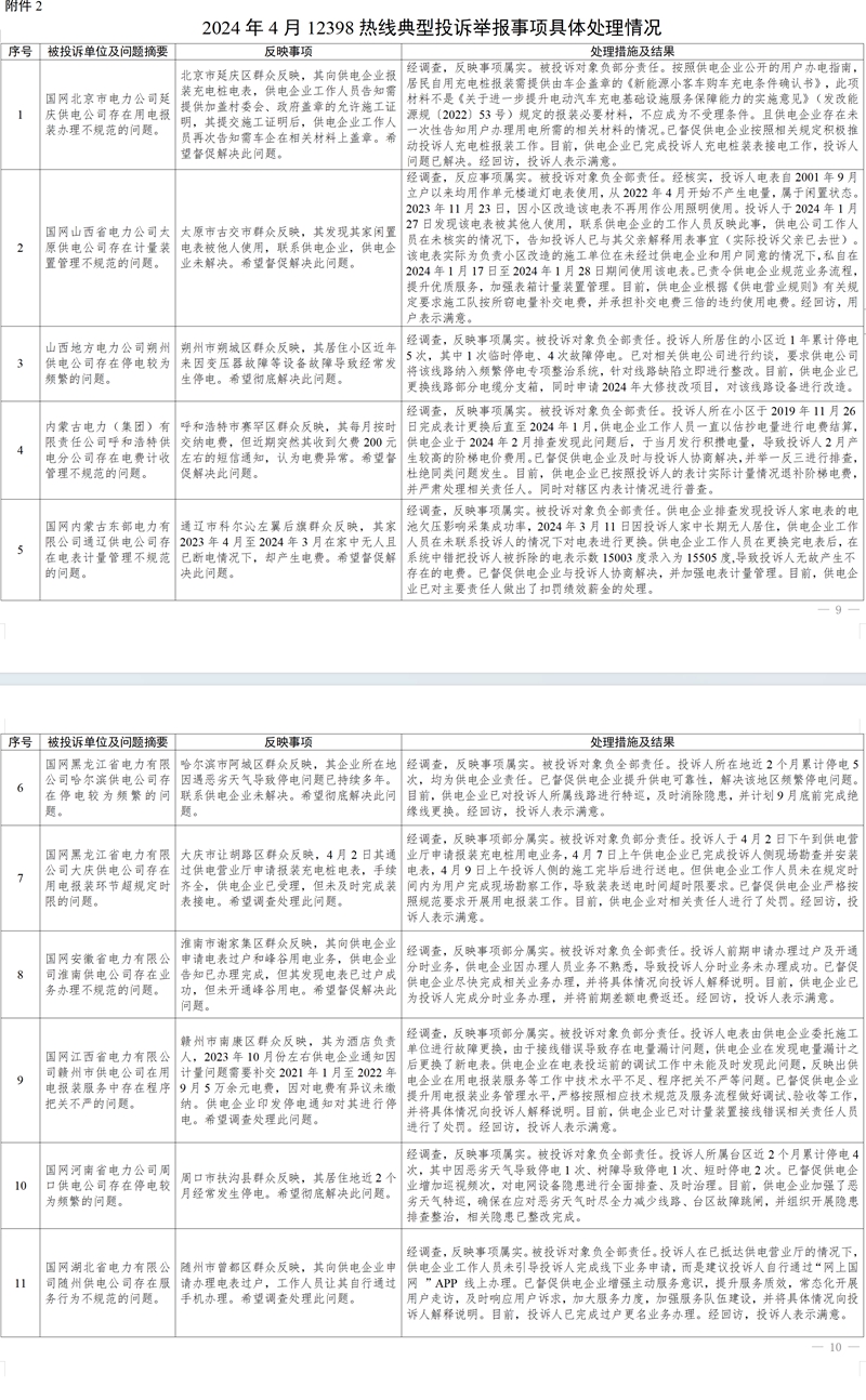 (三)問題處置情況 針對群眾反映的投訴舉報(bào),國家能源局派出機(jī)構(gòu)嚴(yán)格根據(jù)國家有關(guān)法規(guī)政策進(jìn)行處理。一是督促供電企業(yè)加強(qiáng)臺(tái)區(qū)等設(shè)備改造力度,縮短供電半徑,提高電網(wǎng)轉(zhuǎn)供、互供能力,有效解決故障停電、低電壓等電能質(zhì)量問題,進(jìn)一步提升供電可靠性;二是要求供電企業(yè)加強(qiáng)設(shè)備隱患排查整治和停電搶修管理,加強(qiáng)線路巡視頻次,及時(shí)消除隱患缺陷,增加搶修資源投入,提升設(shè)備管控和停電搶修能力,切實(shí)提高供電質(zhì)量;三是通過行政處罰、監(jiān)管約談、責(zé)令整改等方式,糾正有關(guān)企業(yè)違法違規(guī)行為,維護(hù)公平公正的市場秩序和群眾合法權(quán)益;四是通過解釋說明、澄清事實(shí),使群眾消除誤解。(2024年4月12398熱線典型投訴舉報(bào)事項(xiàng)具體處理情況,見附件2)